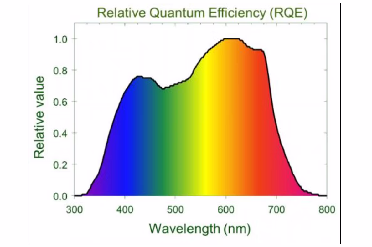 Bağıl kuantum verimlilik eğrisi. (McCree, 1972'den Erik Runkle tarafından uyarlanmıştır. Agric. Meteorology 9: 191-216.)