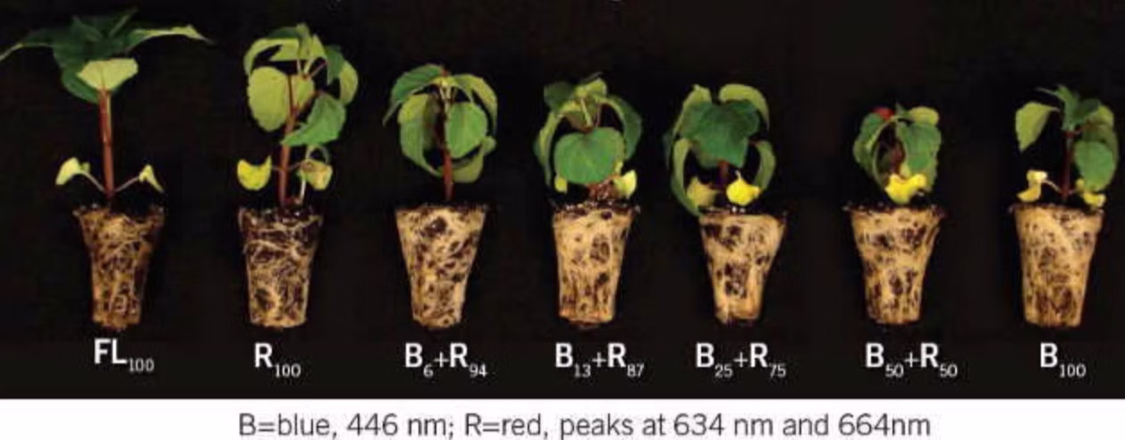 Yalnızca kırmızı ışık altında yetiştirilen bitkilerin yaprak alanı, yüzde 25 veya daha fazla mavi ışıkla yetiştirenlere kıyasla yüzde 50 ila 130 daha büyüktür. Benzer şekilde, sadece kırmızı ışık altındaki bitkiler, yüzde 25 veya daha fazla mavi ışık altındaki bitkilerden yüzde 50 ila 110 daha fazla taze ağırlığa sahiptir.